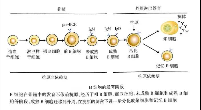 B細(xì)胞在骨髓中的分化發(fā)育需經(jīng)歷祖B細(xì)胞、前B細(xì)胞、未成熟B細(xì)胞、成熟B細(xì)胞等幾個階段。