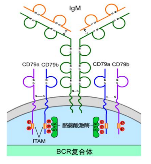 BCR受體是表達(dá)于B細(xì)胞表面的免疫球蛋白,即膜型免疫球蛋白(membrane immunoglobulin,mIg)。B細(xì)胞通過BCR識別抗原,接受抗原刺激,啟動體液免疫應(yīng)答。