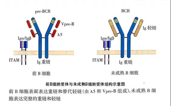 早期的pro-B開始重排重鏈可變區(qū)基因D-J,晚期pro-B的V-D-J基因發(fā)生重排,但此時沒有mIgM(膜結(jié)合型免疫球蛋白M,BCR的主要成分)的表達(dá)。Pro-B開始表達(dá)Igα/Igβ異源二聚體(或稱CD79a/CD79b),Igα和Igβ均屬免疫球蛋白超家族,有胞外區(qū)、跨膜區(qū)和相對較長的胞質(zhì)區(qū);Igα和Igβ在胞外區(qū)的近胞膜處借助二硫鍵相連,構(gòu)成二聚體;Igα/Igβ和mIg的跨膜區(qū)均有極性氨基酸,借靜電吸引而組成穩(wěn)定的BCR復(fù)合物。