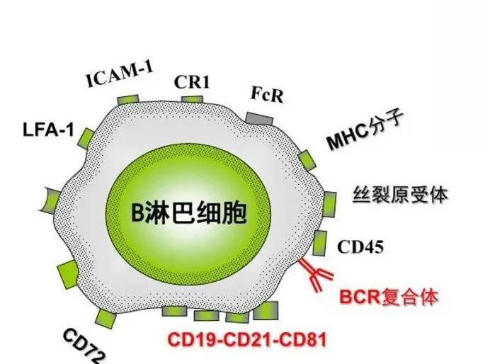 B細(xì)胞還表達(dá)共受體復(fù)合物。B細(xì)胞共受體復(fù)合物由B細(xì)胞表面CD19/CD21/CD81非共價相聯(lián)形成,主要作用是增強(qiáng)B細(xì)胞對抗原刺激的敏感性。CD19是所有B細(xì)胞共有的表面標(biāo)志,參與啟動信號轉(zhuǎn)導(dǎo)、生發(fā)中心生成和抗體親和力成熟。CD21主要表達(dá)于成熟B細(xì)胞,為C3d受體,也是B細(xì)胞上的EB病毒受體。CD81和B淋巴細(xì)胞的增值相關(guān)。