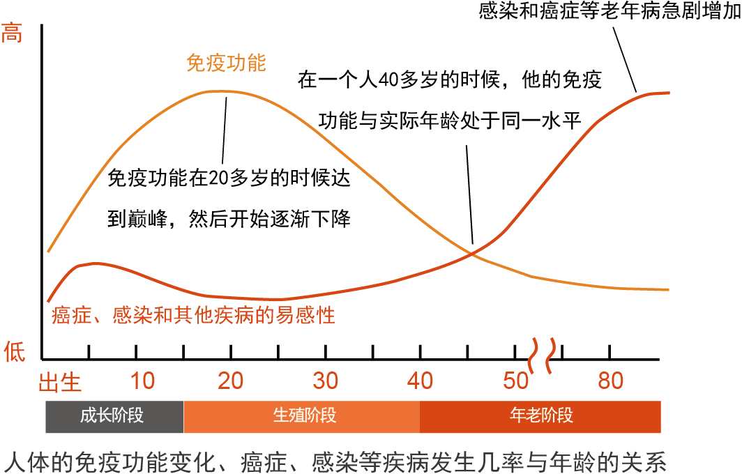 免疫衰老是各機(jī)體免疫系統(tǒng)從器官、細(xì)胞、免疫因子和調(diào)控網(wǎng)絡(luò)等方面的結(jié)構(gòu)和功能衰退,為衰老過(guò)程中最為重要的組成部分,隨著免疫衰老,我們的機(jī)體會(huì)出現(xiàn)抗感染能力下降,疫苗接種免疫效果降低,自身免疫性疾病增加,感染和癌癥發(fā)病率上升等。