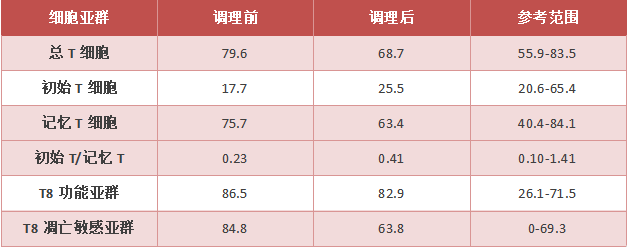 免疫細(xì)胞評(píng)估是免疫功能評(píng)估人體衰老的重要形式,進(jìn)行免疫功能評(píng)估對(duì)個(gè)體有重要意義。當(dāng)免疫功能評(píng)估結(jié)果不佳時(shí),可及時(shí)進(jìn)行調(diào)理,如調(diào)整心態(tài)、健康飲食中醫(yī)調(diào)理,以及免疫調(diào)理等,延緩衰老的進(jìn)程,避免機(jī)體細(xì)胞免疫功能減弱,造成免疫功能低下,易引發(fā)感染和疾病。研究提供了一位案例接受免疫調(diào)理前后的主要數(shù)據(jù)變化。